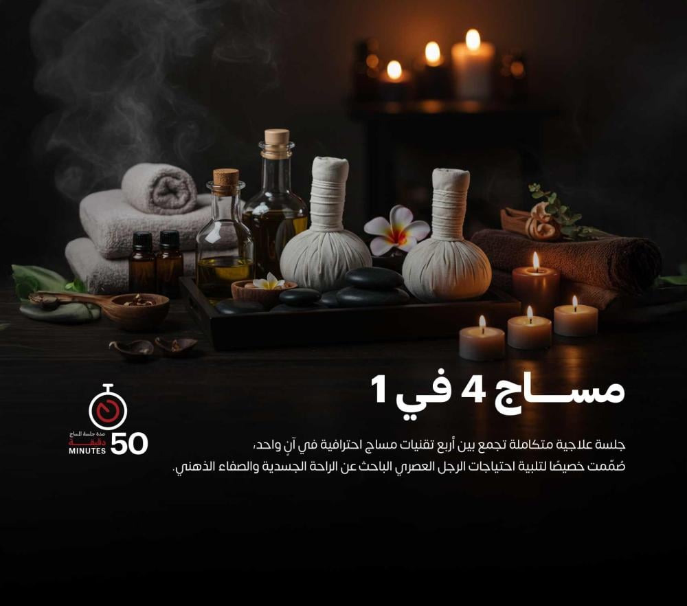 جلسة علاجية متكاملة تجمع بين أربع تقنيات مساج احترافية في آنٍ واحد، صُمّمت خصيصًا لتلبية احتياجات الرجل العصري الباحث عن الراحة الجسدية والصفاء الذهني.